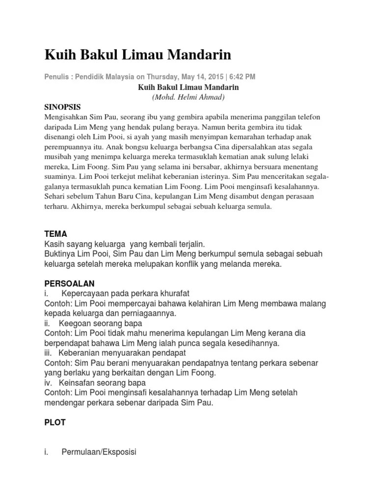 B) berani apabila berusaha menyelamatkan. Sinopsis, tema, persoalan, plot, teknik plot, watak, perwatakan, latar masa, latar tempat, latar masyarakat, gaya bahasa, nilai, . Sinopsis cerpen kuih bakul limau mandarin lim meng yang dihalau oleh bapanya, iaitu lim pooi ingin pulang ke rumahnya sempena sambutan tahun . Lim pooi, sim pau dan lim meng . Dia berkata lim meng itu penyebab perniagaannya menjadi lingkup dan menuduh lim meng penyebab lim foong meninggal dunia. Cerpen kuih bakul limau mandarin . Kasih sayang keluarga yang kembali terjalin menjadi tema kepada cerpen kuih bakul limau mandarin karya mohd. Lim meng akan balik pada tahun baru cina. Sinopsis cerpen kuih bakul limau mandarin (antologi kuingin berterima kasih) Sinopsis mengisahkan sim pau, seorang ibu yang gembira apabila menerima panggilan telefon daripada lim meng yang hendak pulang beraya.